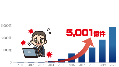 5,001億件もの攻撃がなされています。 - ここ数年、情報搾取等を目的としたサイバー攻撃が顕著になっています。サーバーやパソコンなどのコンピュータシステム に対しネットワークを通じて破壊活動やデータの窃取・改ざんなどを行うサイバー攻撃は近年急増・進化しており、企業規模や業種を問わずさまざまな企業がその標的となっています。